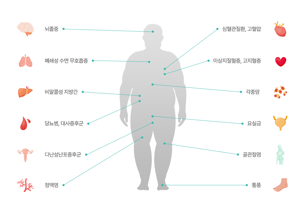 당뇨병 발생은 과체중 및 비만과 밀접한 연관성이 있습니다. 특히 제 2형 당뇨병은 다른 대사질환인 고혈압, 고지혈증, 관상동맥질환보다 비만에 의한 발생의 위험이 높은 대사질환으로, 남녀모두에게서 신체비만지수가 증가할수록 제 2형 당뇨병의 유병률이 증가한다고 알려져 있습니다.